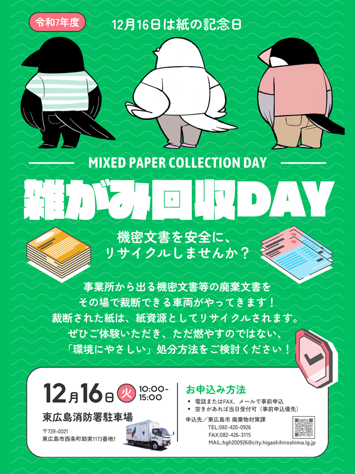 東広島市では、市内事業所の紙ごみの資源化を促進するため、12月16日の「紙の記念日」に「雑がみ回収DAY」を開催します。
