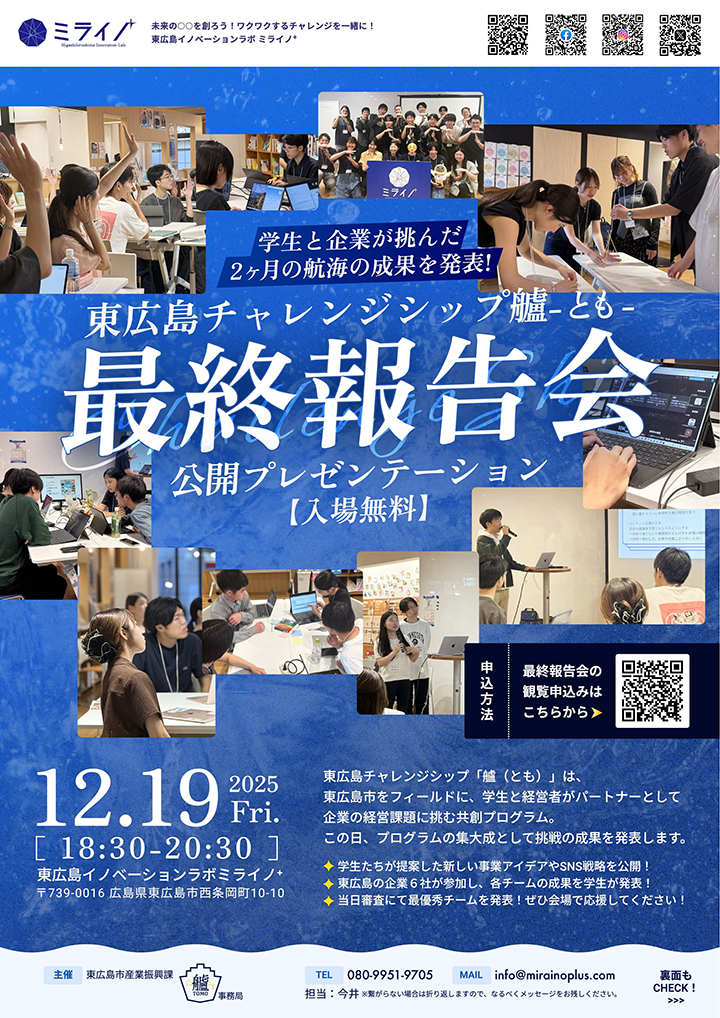 学生と経営者がパートナーとして企業の経営課題に挑む共創プログラム「東広島チャレンジシップ-艫-(とも)」の集大成として、最終報告会を開催します!