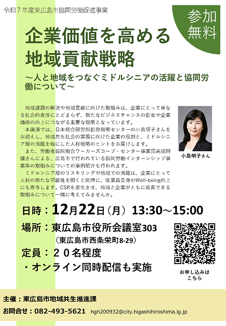日本総研の小島明子氏を講師に招き、「企業が地域貢献に取り組む具体的メリット」、「ミドルシニア人材の活躍を促すリスキニングの最新動向」「協同労働による企業と地域の協働モデル」について事例を交えながらわかりやすく解説します。